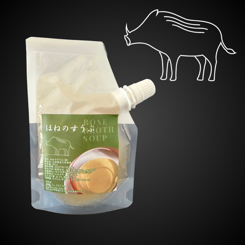 山梨県産の天然猪骨100%から、じっくり旨みを引き出した、わんちゃん・ねこちゃん向けの骨だしすうぷです。